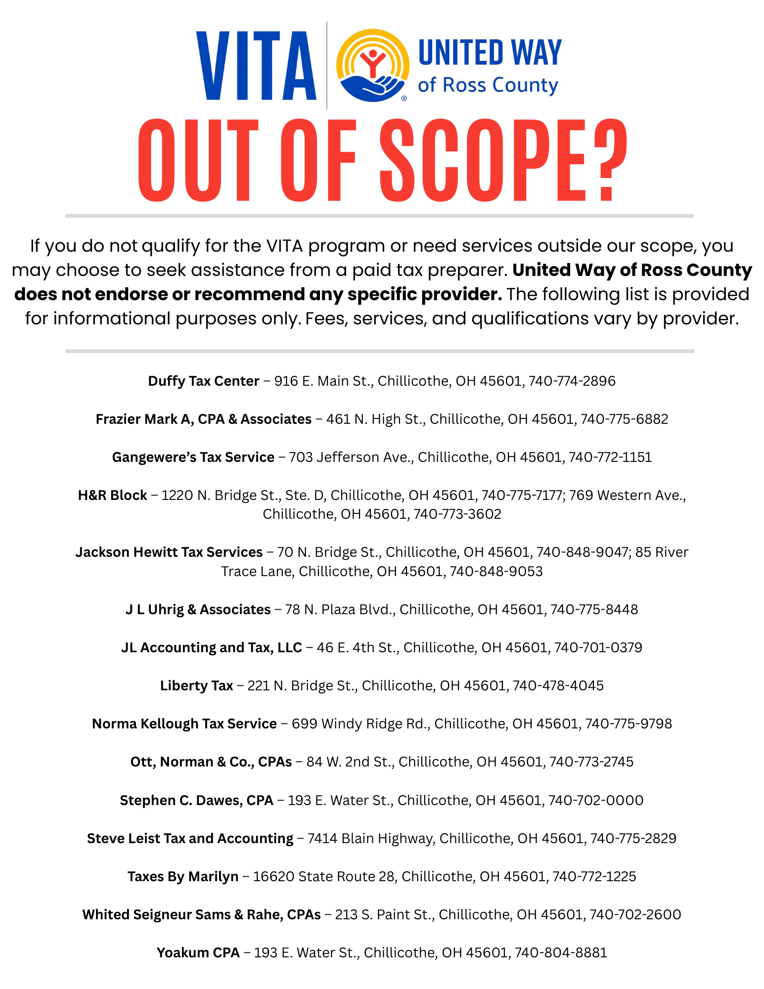 Please note: United Way of Ross County does not endorse or recommend any of the businesses listed. This information is provided solely as a community resource.